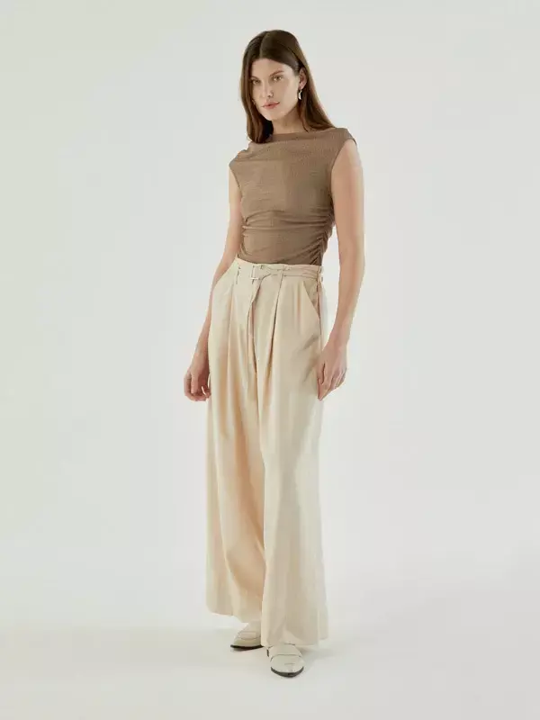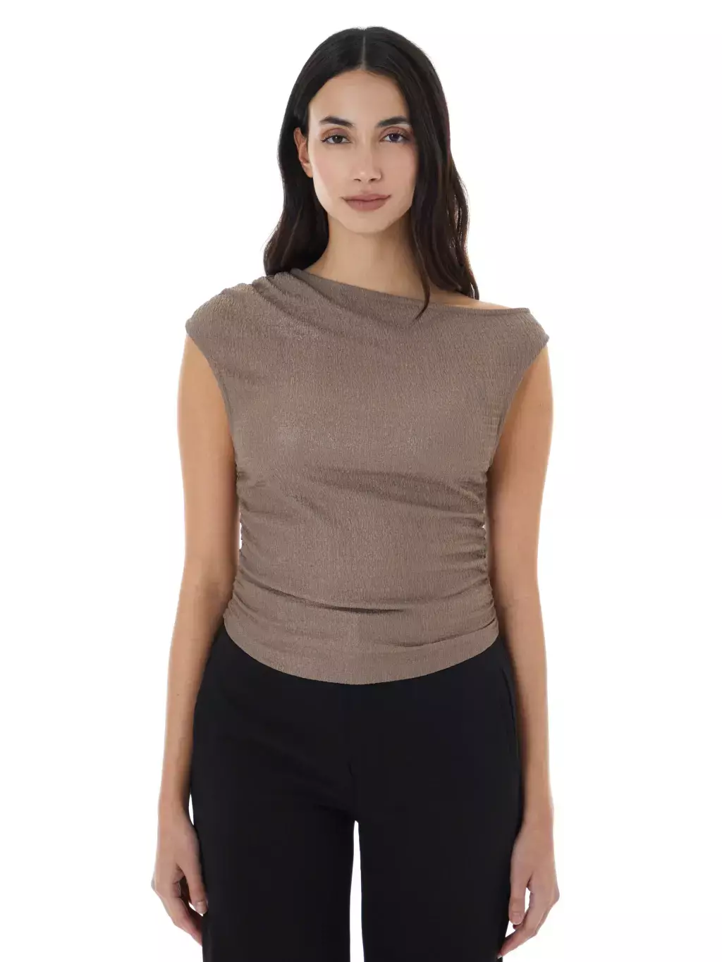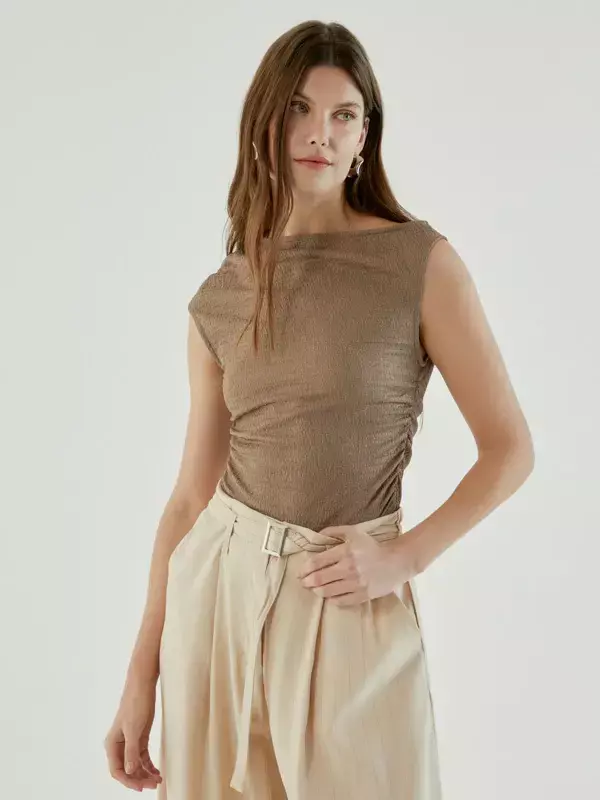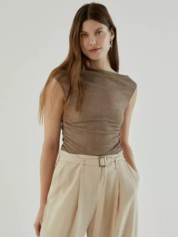 Remera sin mangas confeccionada en tramado liviano, de fitting holgado y largo a primera cadera. Tiene escote redondo y un detalle asimétrico de frunce lateral en delantera, ubicado a la altura de mitad de manga, que aporta un toque de diseño distintivo y favorece la silueta.