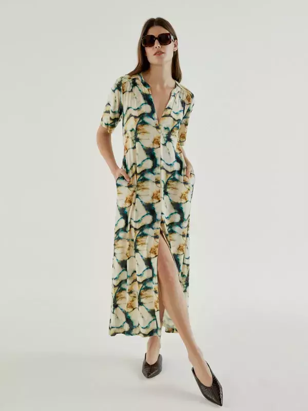 Vestido largo confeccionado en viscosa con elastano estampado, con cuello mao y cartera abierta hasta la altura del busto. Presenta canesú delantero con suaves frunces, mangas cortas y largo a los tobillos. Lleva un tajo en el centro delantero oculto por una vista central que recorre toda la prenda. En la espalda, a la altura de la cintura, incorpora jareta con elástico para aportar calce y comodidad.