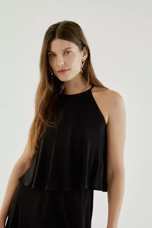 Vestido confeccionado en sedita crepé fluida lisa, con escote halter y diseño de dos capas que conforman el top y la falda con vuelo. El top presenta en la espalda una abertura tipo gota con botón de acceso. De calce suelto y holgado, su largo queda por encima de la rodilla, ofreciendo una silueta fresca y femenina ideal para climas cálidos o eventos informales.